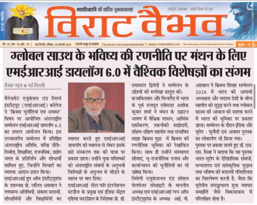 मैनेजमेंट एजुकेशन एंड रिसर्च इंस्टीट्यूट (एमईआरआई) कॉलेज ने ‘ब्रिक्स चुनौतियां एवं अवसर’ विषय पर आयोजित अंतरराष्ट्रीय सम्मेलन एमईआरआई डायलॉग 6.0 का सफल आयोजन किया। इस उच्चस्तरीय सम्मेलन में प्रतिष्ठित अंतरराष्ट्रीय अतिथि, वरिष्ठ नीति निर्माता, शिक्षाविद, राजनयिक, उद्योग जगत के प्रतिनिधि और शोधार्थी शामिल हुए, जिन्होंने विचारों का व्यापक आदान-प्रदान किया।