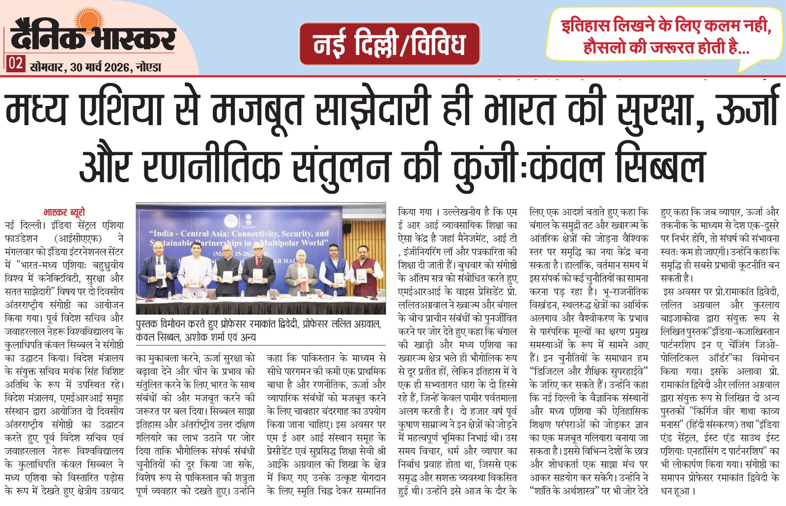इंडिया सेंट्रल एशिया फाउंडेशन (आईसीएएफ) ने मंगलवार को इंडिया इंटरनेशनल सेंटर में “भारत-मध्य एशियाः बहुध्रुवीय विश्व में कनेक्टिविटी, सुरक्षा और सतत साझेदारी” विषय पर दो दिवसीय अंतरराष्ट्रीय संगोष्ठी का आयोजन किया गया। पूर्व विदेश सचिव और जवाहरलाल नेहरू विश्वविद्यालय के कुलाधिपति कंवल सिब्बल ने संगोष्ठी का उद्घाटन किया। विदेश मंत्रालय के संयुक्त सचिव मयंक सिंह विशिष्ट अतिथि के रूप में उपस्थित रहे।