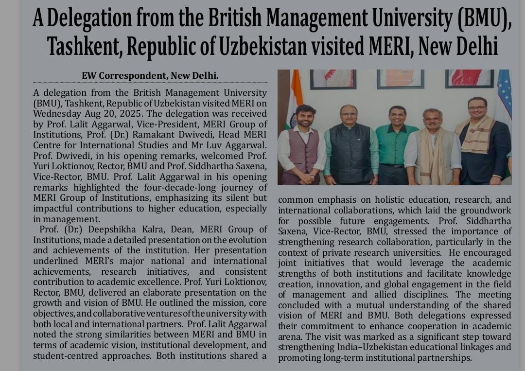 A delegation from the British Management University (BMU), Tashkent, Republic of Uzbekistan visited MERI on Wednesday Aug 20, 2025. The delegation was received by Prof. Lalit Aggarwal, Vice-President, MERI Group of Institutions, Prof. (Dr.) Ramakant Dwivedi, Head MERI Centre for International Studies and Mr Luv Aggarwal. Prof. Dwivedi, in his opening remarks, welcomed Prof. Yuri Loktionov, Rector, BMU and Prof. Siddhartha Saxena, Vice-Rector, BMU. Prof. Lalit Aggarwal in his opening remarks highlighted the four-decade-long journey of MERI Group of Institutions, emphasizing its silent but impactful contributions to higher education, especially in management.