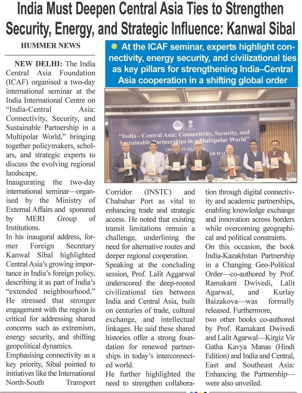 The India Central Asia Foundation (ICAF) organised a two-day international seminar at the India International Centre on Asia: “India-Central Connectivity, Security, and Sustainable Partnership in a Multipolar World,” bringing together policymakers, schol-ars, and strategic experts to discuss the evolving regional landscape. Inaugurating the two-day international seminar-organ-ised by the Ministry of External Affairs and sponsred by MERI Group Institutions. of In his inaugural address, for-mer Foreign Secretary Kanwal Sibal highlighted Central Asia’s growing impor-tance in India’s foreign policy, describing it as part of India’s “extended neighbourhood.’ He stressed that stronger engagement with the region is critical for addressing shared concerns such as extremism, energy security, and shifting geopolitical dynamics.