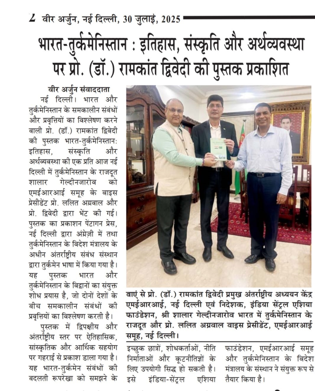 A copy of the book India-Turkmenistan: History, Culture, Economy by Prof. (Dr.) Ramkant Dwivedi and analyses contemporary relations and trends was presented to the Ambassador of Turkmenistan Shalar Geldinazarov in New Delhi today by Prof. Lalit Agarwal, Vice President of MERI Group and Prof. Dwivedi. The book has been published in English by Pentagon Press, New Delhi and in Turkmen by the Institute of International Relations under the Ministry of Foreign Affairs of Turkmenistan.